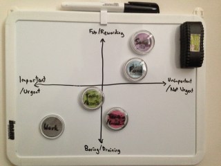 The markers read, from top to bottom, Social, Food, Tasks/E-mails, Teaching/Grading, and Work (i.e. research). Unfortunately, there’s nothing currently in the upper left quadrant, which is where I want to be. In terms of this graph, you can pray that in particular my work moves upwards. In the meantime, I’ve been devoting plenty of time to social and food (and exercise, which isn’t one of the markers yet), which is why they aren’t as urgent right now.
