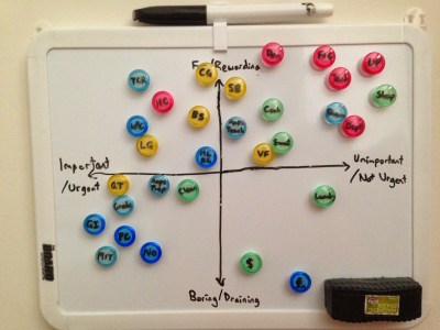 After trying out a couple different ideas, I’ve come across something I find I really like. Here’s the idea: I plot all the various things I have to do on two axes. The first axis is how important or urgent that task is. The second axis is how enjoyable, fun or rewarding it is. Earlier, I posted a cruder version, but here’s what that graph currently looks like: