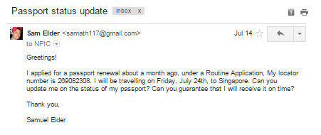 As you can see, this situation started to have serious consequences for our relationship. Grace saw my refusal to request expedited service from the beginning as evidence that it didn’t matter that much to me whether I’d be able to actually go to Singapore. I maintained that it was not a difference in priorities, but expectations about how quick/competent the passport agency would be, and that she had just been right. From this point, I started taking more initiative with checking in, but Grace was always there to remind me as well.