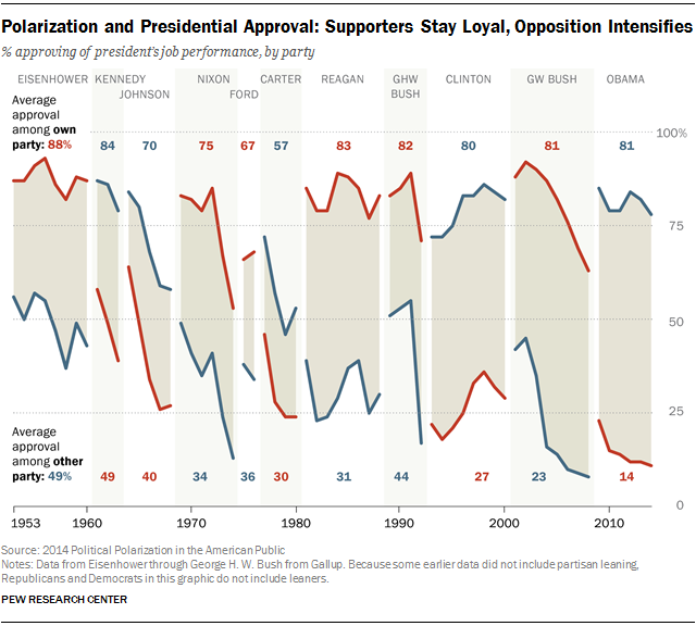 • Growing partisan antipathy: Percentage with a “very unfavorable” view of the opposite party has gone from 16%/17% to 38%/43% (D/R). Obama’s, GW Bush’s, and Clinton’s approval ratings by the other party all broke records, descending from 27% to 23% to 14%, yet in-party approval ratings have held steady: