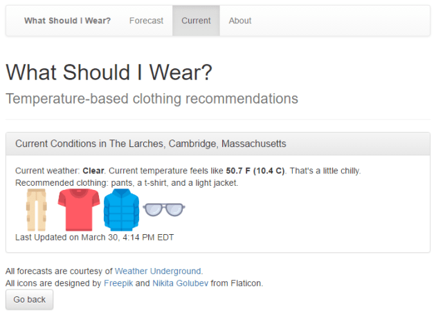 - And of course, anyone else can use it, too! The app pulls the location of your IP address (which actually was just built into the Weather Underground API), so it should apply wherever you’re at.