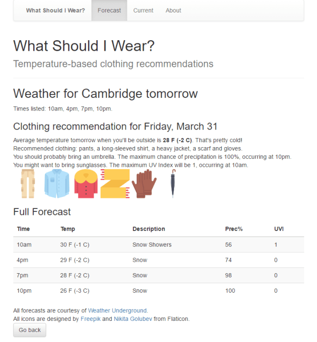 - The result now gives a list in words and icons of what clothing items I should wear. No more memory needed!
