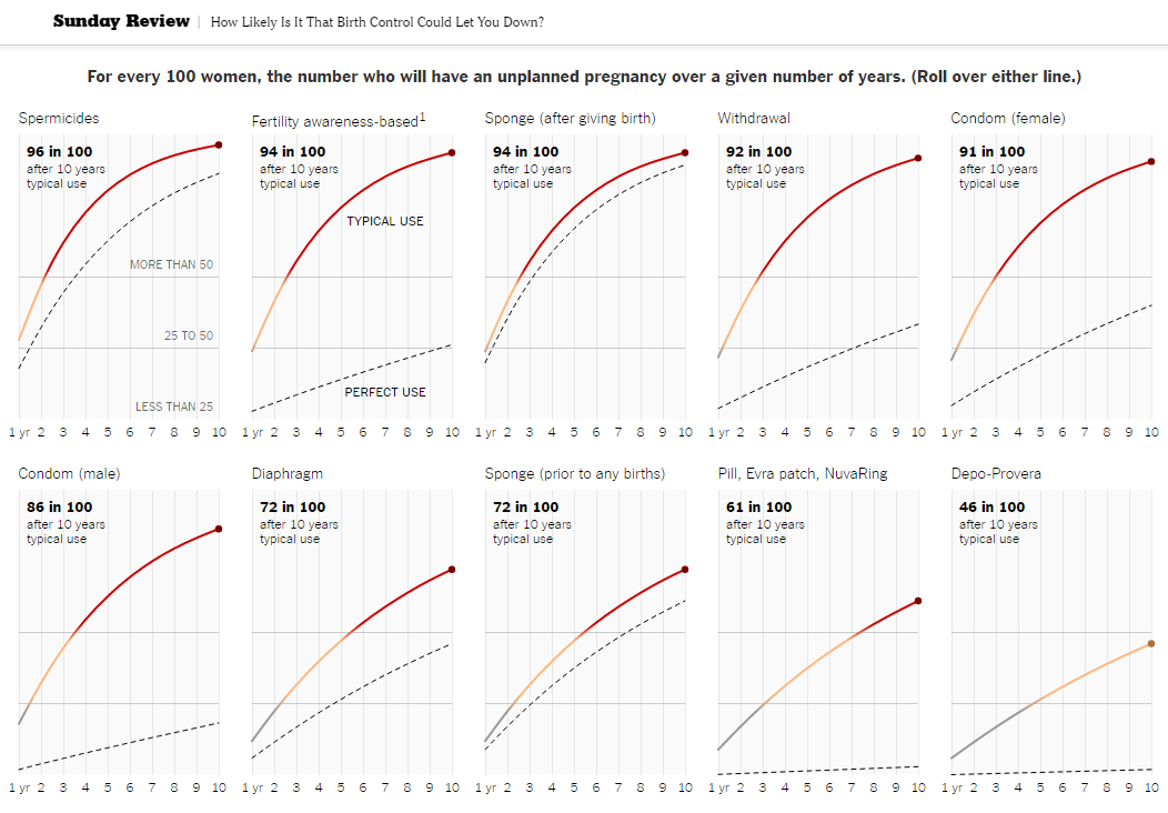 Naturally, one big component of the sexual revolution was the advent of the pill and the proliferation of contraceptive methods reducing the link between sex and pregnancy. But for most methods, that link is by no means eliminated. Just soak in their (in)effectiveness rates (source):
