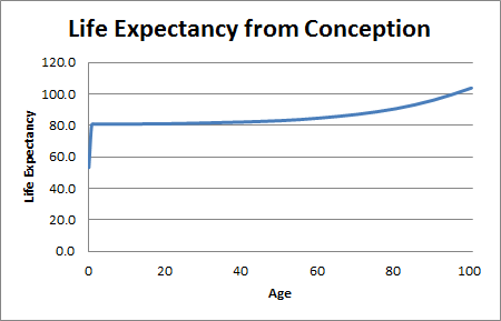 That big dip on the left is the harrowing process of surviving the womb. In other words, if you’ve already lived to 100, you still haven’t gained as many years since you were young as we all did just for surviving to birth. Almost all of us who were born live a long life compared to the average.