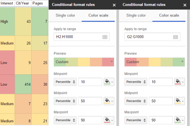 Those rules can be simple text rules like “contains ‘yes’”, or numerical rules like “is negative”. In most of the latter cases, though, I prefer to use the “color scale” option, which lets me specify a three-point scale and which automatically assigns a blend of the colors specified depending on where on that scale each value lies. For instance, in a Google spreadsheet of relevant papers in a recent literature search I did, I applied color scales to columns for the number of citations (green = 90th percentile, red = 10th percentile) and number of pages (the opposite), as well as a text-based column describing their relevance. This helped my collaborators easily see which papers were both important and easily read in the literature.