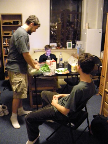 Working on my laptop in my sophomore year room, as my roommate Chris White prepares something to eat on the left, and neighbor Chris Bilinski lounges in the front. The loveseat, card table, and extra chairs made our room a great place to gather and work together on homework. Photo courtesy of Nina Ng-Quinn.
